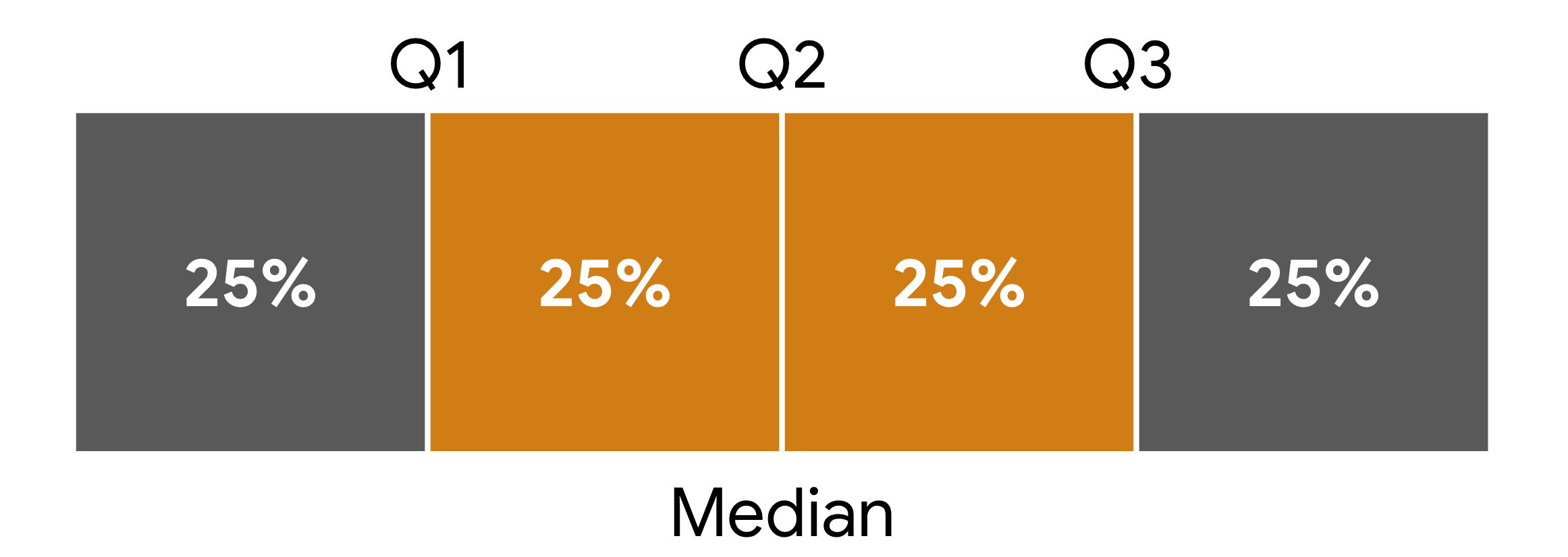 - Quartiles split data into four equal parts (Q1 at 25th percentile, Q2 at 50th percentile, Q3 at 75th percentile)
